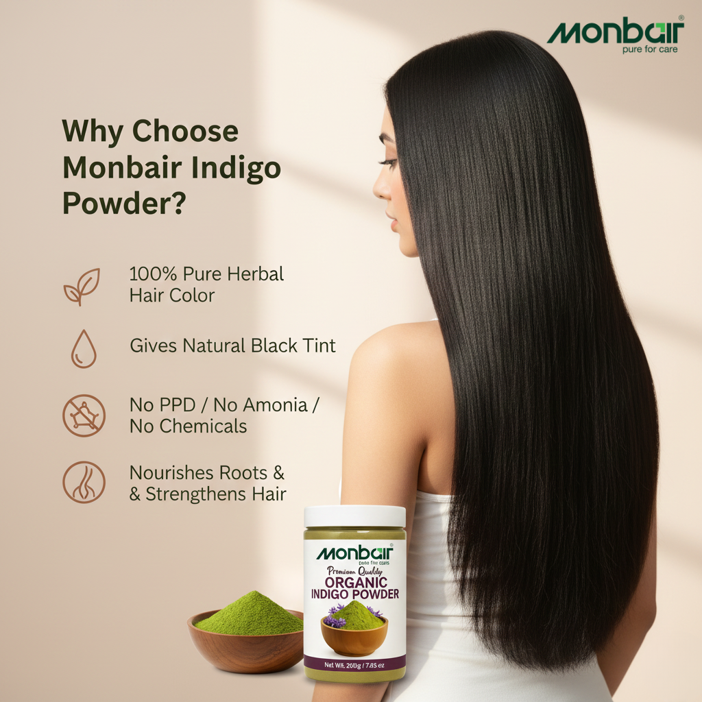 It’s advisable to keep it on your hair for up to 2 hours to get the rich black color. Rinse thoroughly with water.Wash your hair with a cleansing shampoo the next day. Monbair Organic Indigo Combined with Monbair Organic Henna Combine the Monbair henna powder and lemon juice in a mixing bowl. Add water and stir this mixture until you have a thick paste. Cover the bowl with plastic wrap and leave it on overnight for the dye in the henna to release. Drape an old towel around your shoulders and put on your rubber gloves. Start applying henna with a hair coloring brush right from the roots to the ends.
