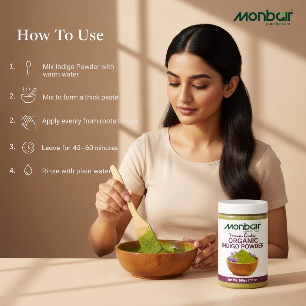 hair? After rinsing your hair, let them dry. Mix the Monbair Indigo Powder (100 gms for short hair, 200 gms for shoulder-length hair, 300 gms for long hair) in warm water to prepare a paste. Apply on your hair, using gloves if applying with your hands, or a spatula. Leave on for 45 minutes, or more, depending on preferred intensity.