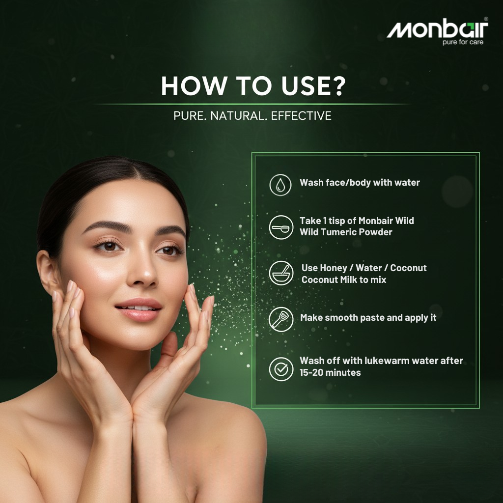 1. Combine: Mix one tablespoon of Monbair Wild Turmeric Powder with two tablespoons of a suitable base like raw milk, yogurt (curd), or pure rose water to form a smooth paste.